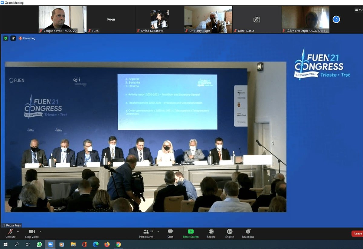 The Federal Union of European Nationalities (FUEN) organised its 65th Annual Congress on 9-12 September 2012 in the city of Trieste, Italy, hosted by the Slovenian minority living in Italy. Western Thrace Turks from the Working Group of Turkic Minorities/Communities in FUEN (TAG) participated in the hybrid congress physically, while other TAG members participated online due to travel restrictions within the scope of covid-19 outbreak.